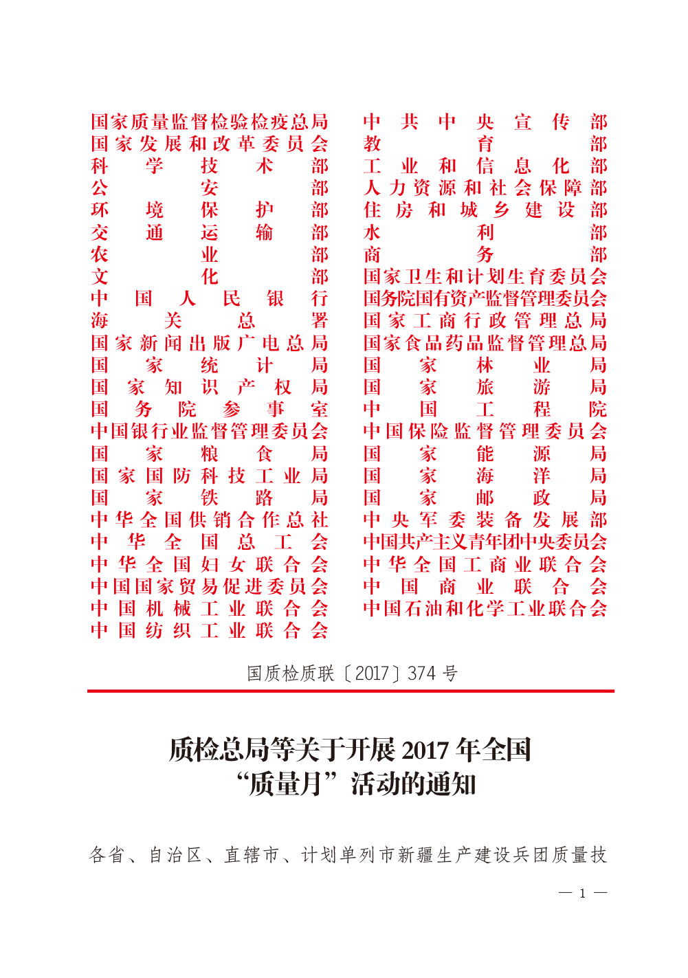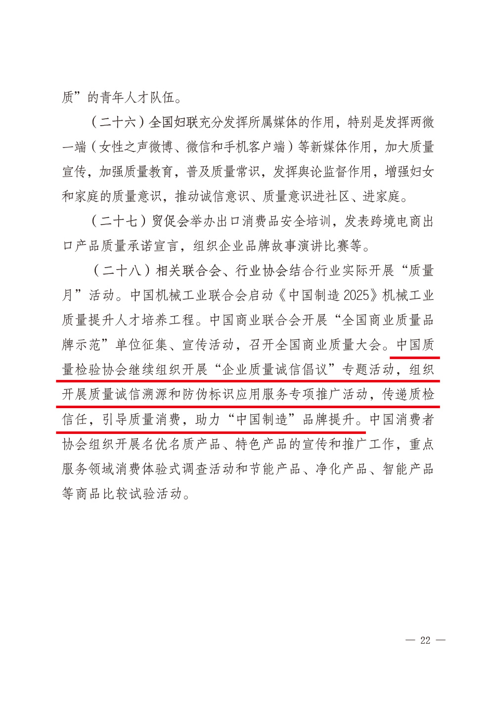2017年8月23日,國家質(zhì)檢總局和中共中央宣傳部、國家發(fā)改委、科學(xué)技術(shù)部、工業(yè)和信息化部、公安部、農(nóng)業(yè)部、商務(wù)部、國家工商總局、國家食藥監(jiān)總局等47個單位(部門)聯(lián)合印發(fā)的《質(zhì)檢總局等關(guān)于開展2017年全國“質(zhì)量月”活動的通知》(國質(zhì)檢質(zhì)聯(lián)〔2017〕374號)再次明確安排部署中國質(zhì)量檢驗協(xié)會:繼續(xù)組織開展“企業(yè)質(zhì)量誠信倡議”專題活動,開展質(zhì)量誠信溯源和防偽標(biāo)識應(yīng)用服務(wù)專項推廣活動;同時,還將中國質(zhì)量檢驗協(xié)會服務(wù)工作核心價值“傳遞質(zhì)檢信任,引導(dǎo)質(zhì)量消費”列入2017年全國“質(zhì)量月”活動宣傳口號。