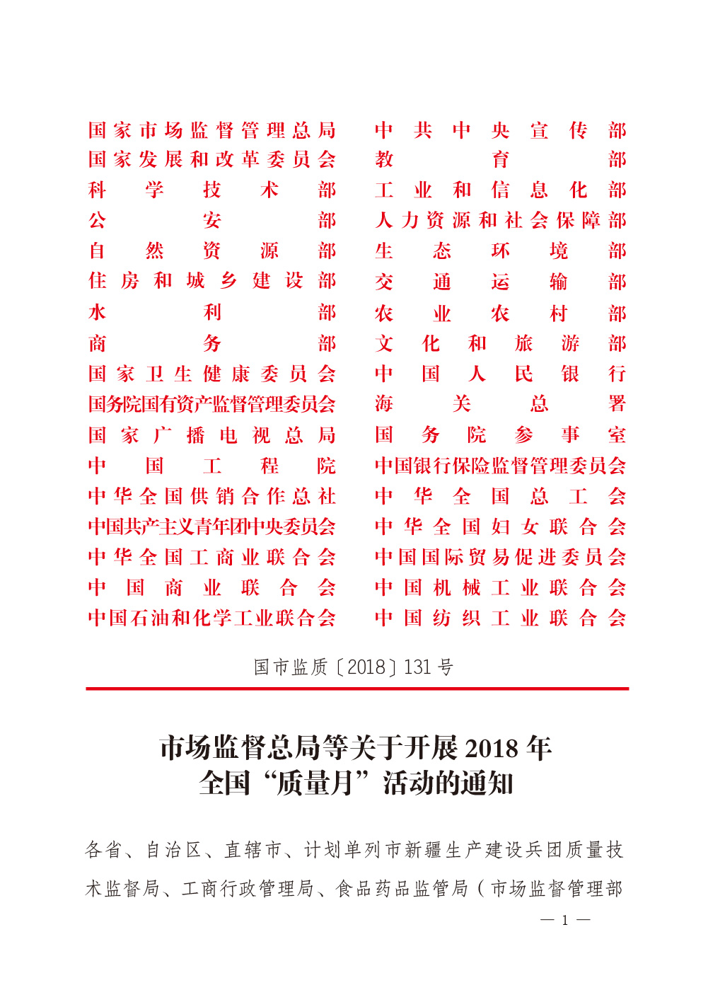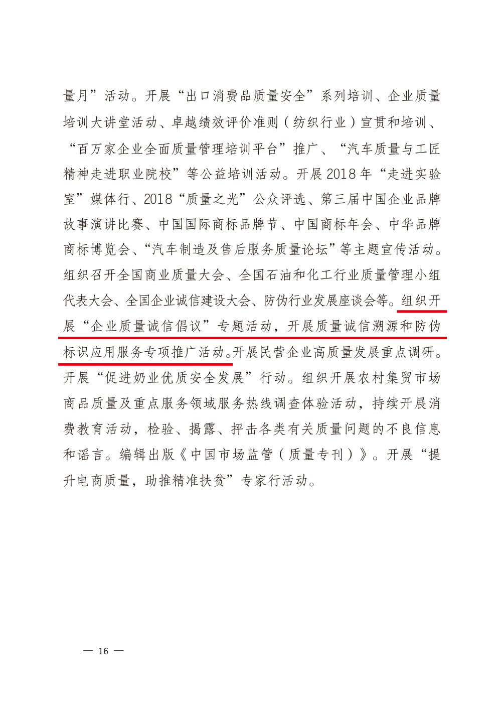 2018年8月16日,國家市場監(jiān)督管理總局、中共中央宣傳部、國家發(fā)展和改革委員會、教育部、科學(xué)技術(shù)部、工業(yè)和信息化部、公安部、人力資源和社會保障部等2018年全國“質(zhì)量月”活動主辦單位聯(lián)合印發(fā)《市場監(jiān)管總局等關(guān)于開展2018年全國“質(zhì)量月”活動的通知》(國市監(jiān)質(zhì)〔2018〕131號),并在《2018年全國“質(zhì)量月”主辦單位開展的主要活動》中明確部署中國質(zhì)量檢驗協(xié)會:組織開展“企業(yè)質(zhì)量誠信倡議”專題活動,開展質(zhì)量誠信溯源和防偽標(biāo)識應(yīng)用服務(wù)專項推廣活動。