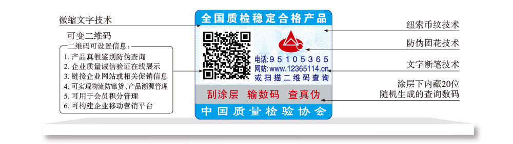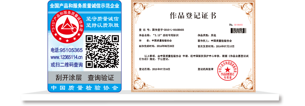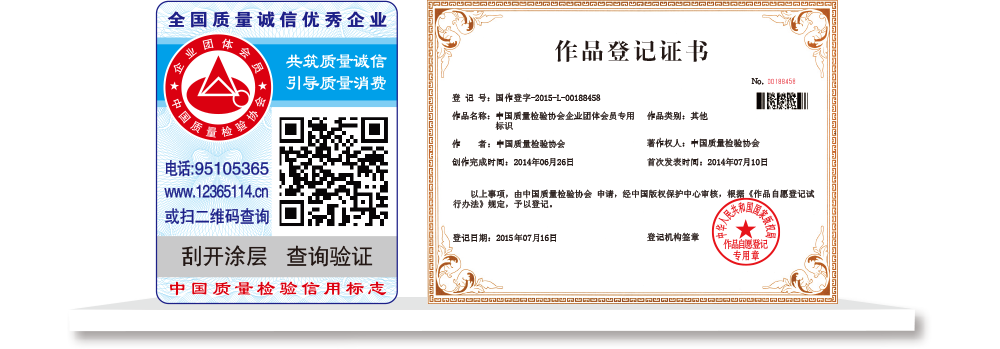 【“全國質(zhì)檢穩(wěn)定合格產(chǎn)品”專用標(biāo)識】具有專屬的知識產(chǎn)權(quán)(經(jīng)中國版權(quán)保護中心審核,國家版權(quán)局對“全國質(zhì)檢穩(wěn)定合格產(chǎn)品”專用標(biāo)識頒發(fā)了《作品登記證書》,登記號:國作登字-2015-L-00188456),基本規(guī)格為5cm2,集電話電碼防偽查詢、二維碼在線掃描、微信驗證等多種功能于一體,綜合運用了紐索幣紋、微縮文字、熒光激發(fā)油墨等多種防偽技術(shù);專用標(biāo)識加貼在產(chǎn)品或包裝上,消費者只需要用座機(手機)電話撥打全國范圍內(nèi)都不需要加區(qū)號的特服號碼95105365或使用手機掃描二維碼或登陸網(wǎng)站(http://www.12365114.cn)就可直接查詢驗證加貼專用標(biāo)識的產(chǎn)品為中國質(zhì)量檢驗協(xié)會調(diào)查匯總證明的全國質(zhì)量檢驗穩(wěn)定合格產(chǎn)品,助力企業(yè)通過“質(zhì)量檢驗”的比較優(yōu)勢去贏得消費者更多的信任,形成企業(yè)自己獨有的比較優(yōu)勢。