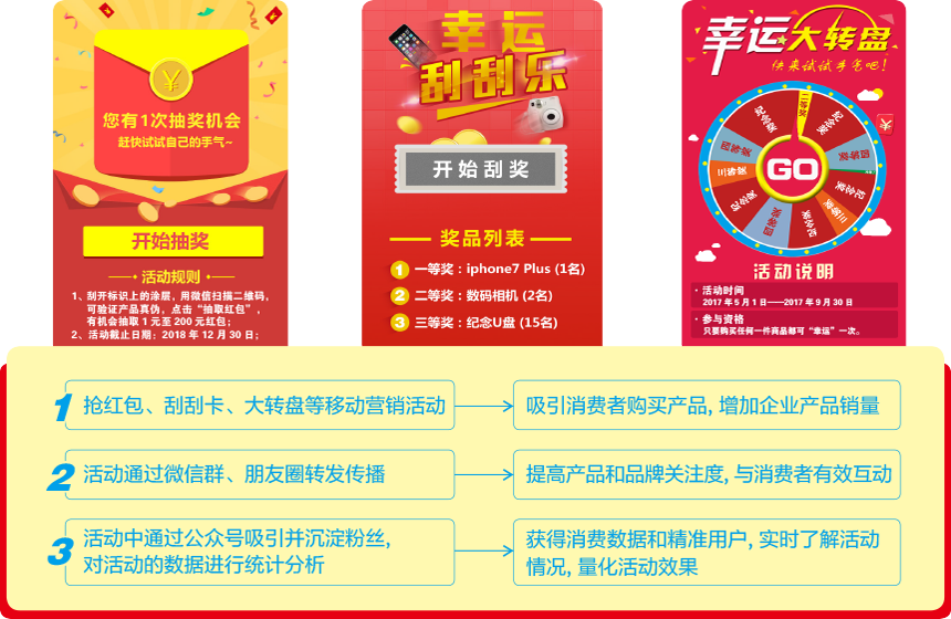 消費者購買企業(yè)的產(chǎn)品后,掃描標(biāo)識上的二維碼,參與企業(yè)設(shè)置的搶紅包、刮刮卡、大轉(zhuǎn)盤等營銷互動活動,中獎后直接進入微信公眾號領(lǐng)取,操作簡單方便,在實現(xiàn)企業(yè)促進產(chǎn)品銷售的同時,還可增加企業(yè)微信公眾號的粉絲數(shù)量;同時,充分利用移動互聯(lián)網(wǎng)易于傳播的特性,實現(xiàn)企業(yè)品牌的廣泛傳播,采用多種移動創(chuàng)新營銷方式,結(jié)合數(shù)據(jù)統(tǒng)計分析,幫助企業(yè)實現(xiàn)精準(zhǔn)營銷;另外,通過抽獎、助力、積分兌換等主流營銷活動,吸引、刺激消費者持續(xù)消費、分享傳播,進而有效提高企業(yè)的產(chǎn)品銷量;還有,也可針對企業(yè)某一種產(chǎn)品進行單獨促銷開展?fàn)I銷活動,消費者掃描二維碼參與營銷互動活動,輕松實現(xiàn)促銷之目的,收集營銷活動數(shù)據(jù),借助大數(shù)據(jù)分析,分析消費者的特征、分布、消費習(xí)慣等信息,引導(dǎo)企業(yè)的市場營銷戰(zhàn)略和銷售策略,使企業(yè)營銷舉措更加精準(zhǔn)有效。