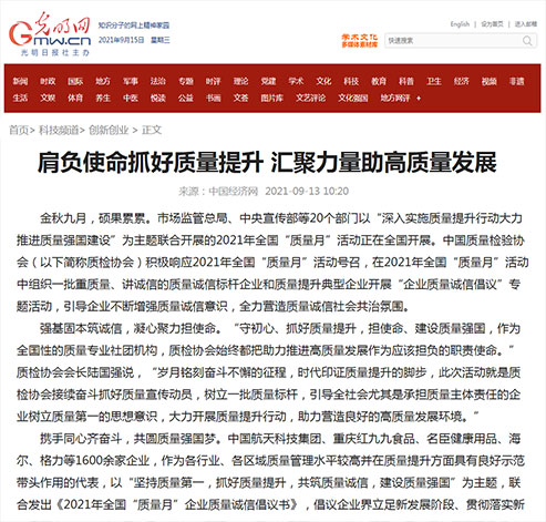 光明網(wǎng):肩負(fù)使命抓好質(zhì)量提升 匯聚力量助高質(zhì)量發(fā)展——中國(guó)質(zhì)量檢驗(yàn)協(xié)會(huì)組織開(kāi)展2021年全國(guó)“質(zhì)量月”企業(yè)質(zhì)量誠(chéng)信倡議專(zhuān)題活動(dòng)