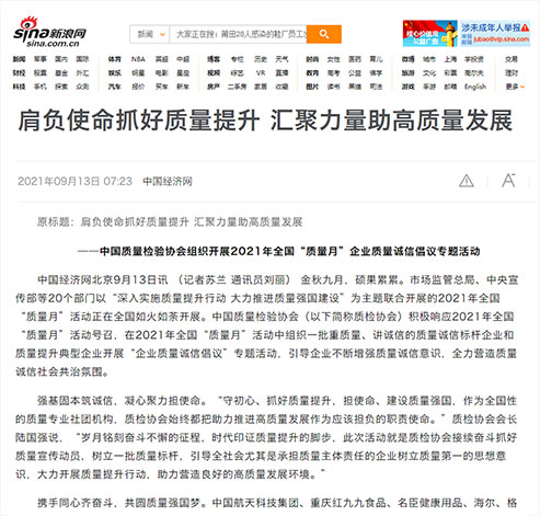 新浪網(wǎng):肩負(fù)使命抓好質(zhì)量提升 匯聚力量助高質(zhì)量發(fā)展——中國(guó)質(zhì)量檢驗(yàn)協(xié)會(huì)組織開(kāi)展2021年全國(guó)“質(zhì)量月”企業(yè)質(zhì)量誠(chéng)信倡議專(zhuān)題活動(dòng)