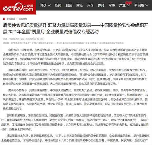 央視網(wǎng):肩負(fù)使命抓好質(zhì)量提升 匯聚力量助高質(zhì)量發(fā)展——中國(guó)質(zhì)量檢驗(yàn)協(xié)會(huì)組織開(kāi)展2021年全國(guó)"質(zhì)量月"企業(yè)質(zhì)量誠(chéng)信倡議專(zhuān)題活動(dòng)