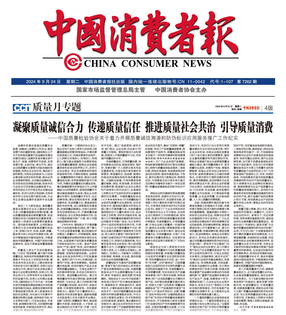 - 中國消費者報—凝聚質(zhì)量誠信合力 傳遞質(zhì)量信任 推進質(zhì)量社會共治 引導質(zhì)量消費——中國質(zhì)量檢驗協(xié)會關于著力開展質(zhì)量誠信溯源和防偽標識應用服務推廣工作紀實