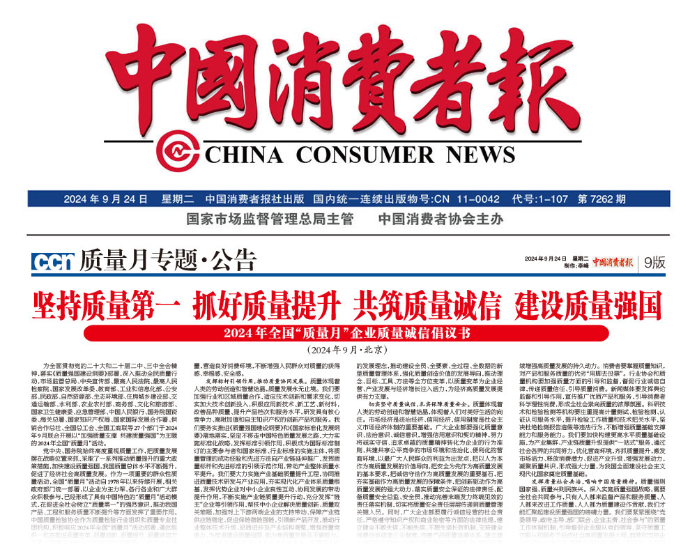 - 中國質(zhì)量報—堅持質(zhì)量第一抓好質(zhì)量提升 共筑質(zhì)量誠信 建設質(zhì)量強國——2024年全國“質(zhì)量月”企業(yè)質(zhì)量誠信倡議書(2024年9月·北京)