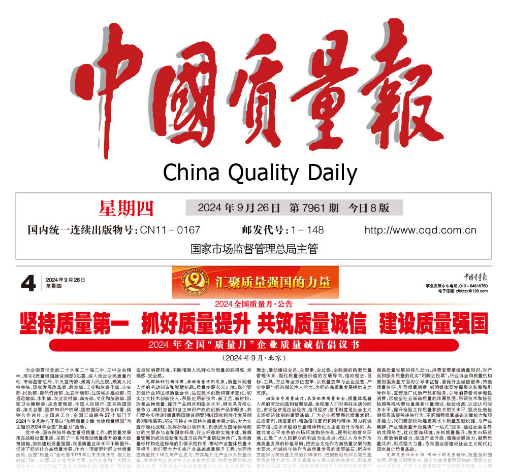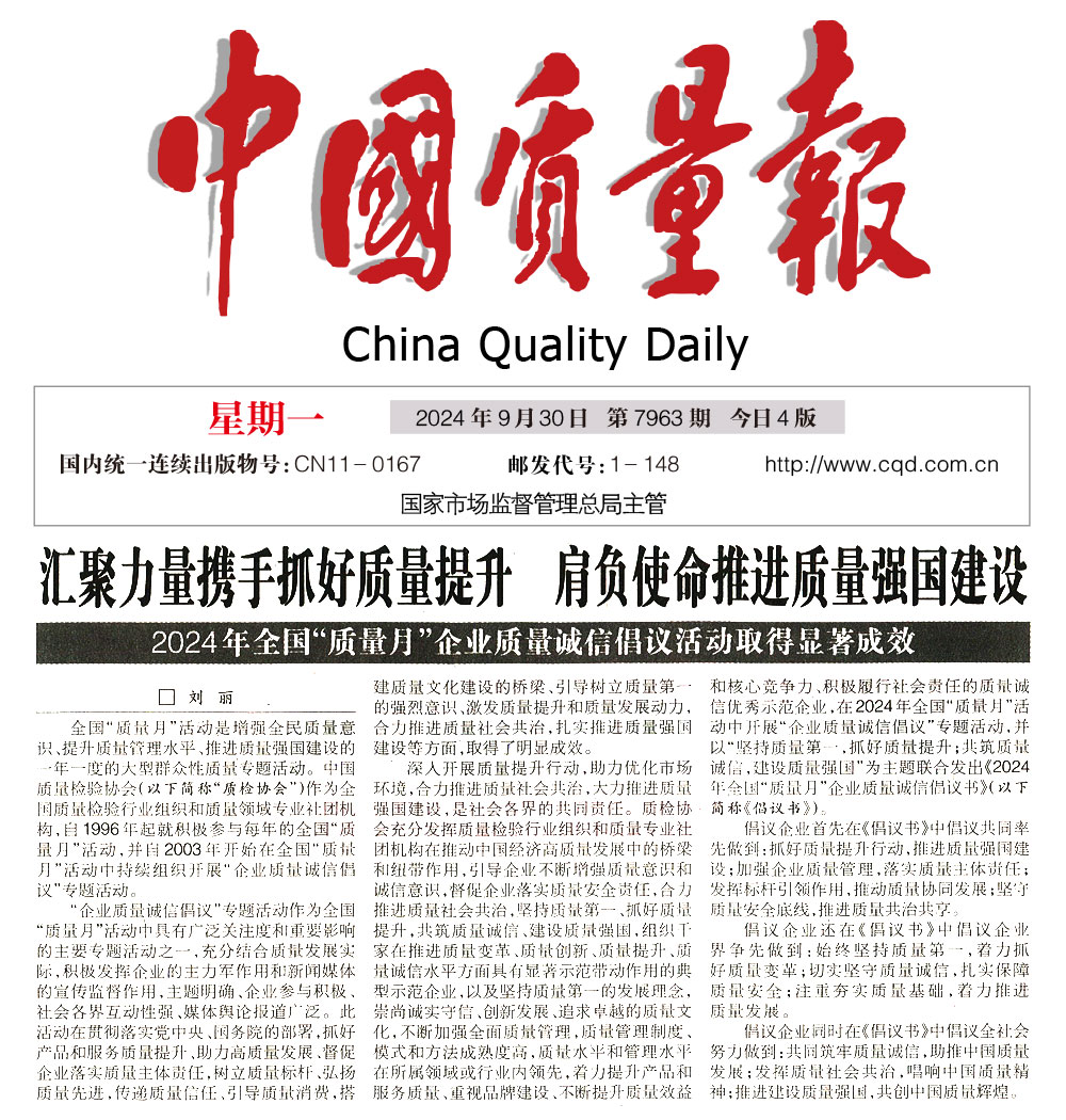 - 中國質(zhì)量報—匯聚力量攜手抓好質(zhì)量提升 肩負使命推進質(zhì)量強國建設——2024年全國“質(zhì)量月”企業(yè)質(zhì)量誠信倡議活動取得顯著成效