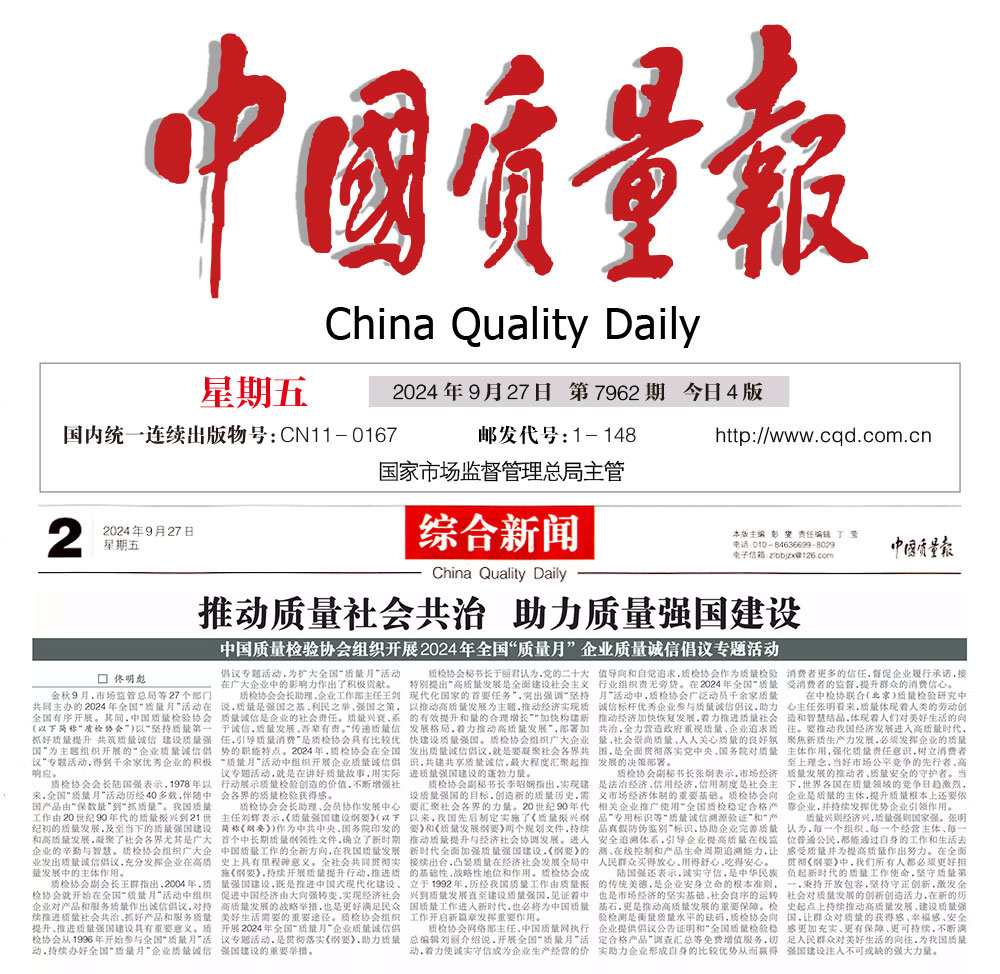- 中國質(zhì)量報—堅持質(zhì)量第一推動質(zhì)量社會共治 助力質(zhì)量強國建設——中國質(zhì)量檢驗協(xié)會組織開展2024年全國“質(zhì)量月” 企業(yè)質(zhì)量誠信倡議專題活動