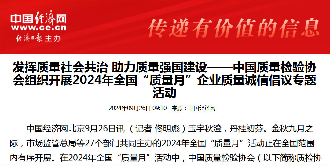 - 中國經(jīng)濟網(wǎng)—全國“質(zhì)量月”千家企業(yè)倡議:共筑質(zhì)量誠信 建設質(zhì)量強國——中國質(zhì)量檢驗協(xié)會組織開展2024年全國“質(zhì)量月”企業(yè)質(zhì)量誠信倡議活動