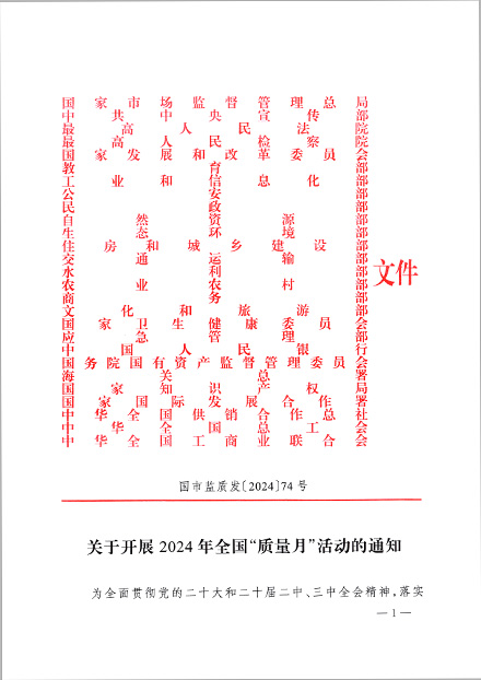 2024年9月,市場監(jiān)管總局、中央宣傳部、最高人民法院、最高人民檢察院、國家發(fā)展改革委等27個部門以“加強質(zhì)量支撐 共建質(zhì)量強國”為主題,聯(lián)合開展2024年全國“質(zhì)量月”活動,全面貫徹黨的二十大和二十屆二中、三中全會精神,落實《質(zhì)量強國建設(shè)綱要》(以下簡稱《綱要》)部署,深入推動全民質(zhì)量行動。